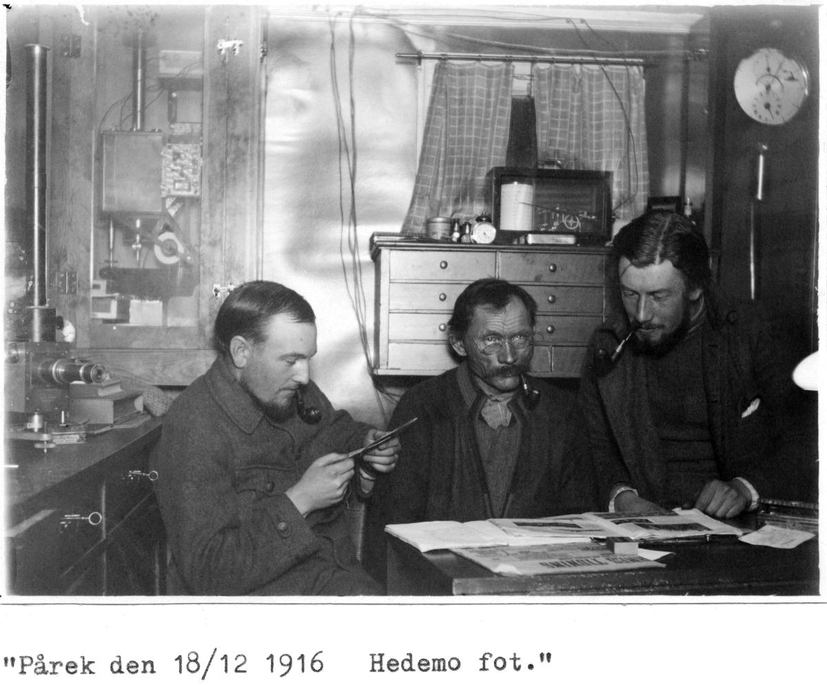 De tre bör vara, från vänster: Bror Hedemo, Lars Nilsson Tuorda och Manne Hofling. Bror Hedemo var stationerad i Pårek 1916-1917. Lars Nilsson Tuorda gick med bördor sträckan Kvikkjokk-Pårek-Pårtejåkkå. Han deltog i Nordenskiölds expedition till Grönland 1883, där han skidade 460 kilometer på 57 timmar tillsammans med Anders Rassa. Manne Hofling var assistent i Pårtetjåkkå 1 juli 1916 - 30 juni 1917, och fortsatte efter det för att tjänstgöra ett år till. Anledningen var att upprätthålla meterologiska observationer. Här har han gått ner till Pårekstugan, som ligger i björkskogen. Till skillnad från kalfjällstoppen Pårtetjåkkå, där han var stationerad. (källa: Lars Andersson: Hambergsboken)