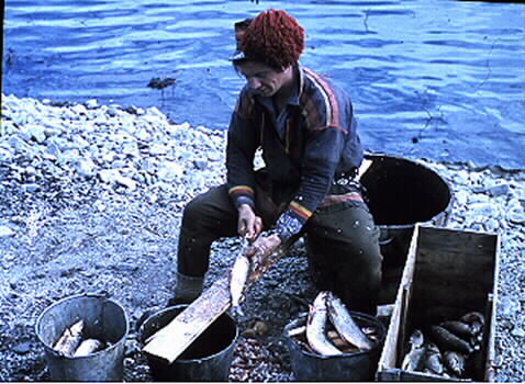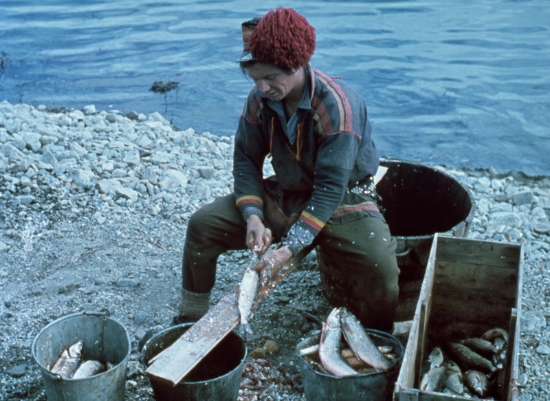 1990:11:00210:D :: fiskrensning, hink, tunna, dräkt, manskolt, mössa, karesuandosamisk dräkt, nordsamisk dräkt