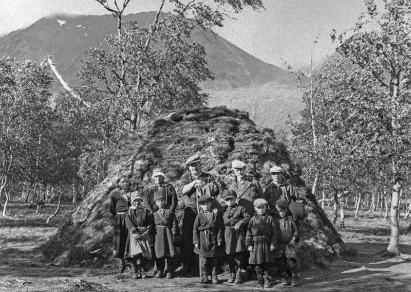 1986:6:00028:A :: grupporträtt, lärare, barn, handelsman, kvinna, torvkåta, sommarskola, skolkåta