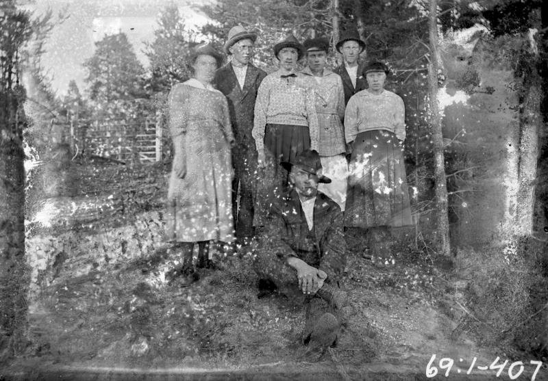 grupporträtt; Om fotografen Anders Jakobsson berättar hans dotter Elin Jakobsson i boken "Porsi i ord och bild" från 1992.Hon berättar att fadern var fotograf. Den första i "södra delen av socken". Wästfelt från Jokkmokk var fotograf i Norra delen. Anders började nog fotografera 1899-1901. Glasplåtar. Det fotograferades till vigslar, barndop, begravningar, beväringsfoton, familjefoton, ja det mesta som hände i bygden. Enligt boken dog Anders Jakobsson föräldrar och barnen utackorderades då. Den äldste sonen Anders Jakobsson kom till en bondgård ett par mil längre bort som heter Padjerim. Där fick han slita ont med så lite materiella förnödenheter som möjligt. Någon hästkarl var han nu inte, han hade desto mer håg för maskiner och dylikt. Den lille klena gossen sysslade med sina uppfinningar, till de äldre och kamraternas förundran. Han var ej lik de andra. Anders var medlem i Missionsvännerna i bygden. Han skänkte marken som Missionshuset byggdes på i Porsi. Anders Jakobsson sysslade med mycket, som hans kropp orkade med. Han var klockslagare, och lagade allt möjligt, han snickrade m.m. När han fyllt 50 år tog han körkort i Luleå. Han köpte den första bilen i Porsi, år 1923, tydligen en lastbil. Anders Jacobsson föddes år 1865 och dog år 1940.