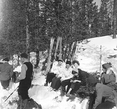 Samernas Folkhögskolas elever, vinterkursen 1951-1952. En skidutflykt i vårsolen, vid kaffeelden i skogen