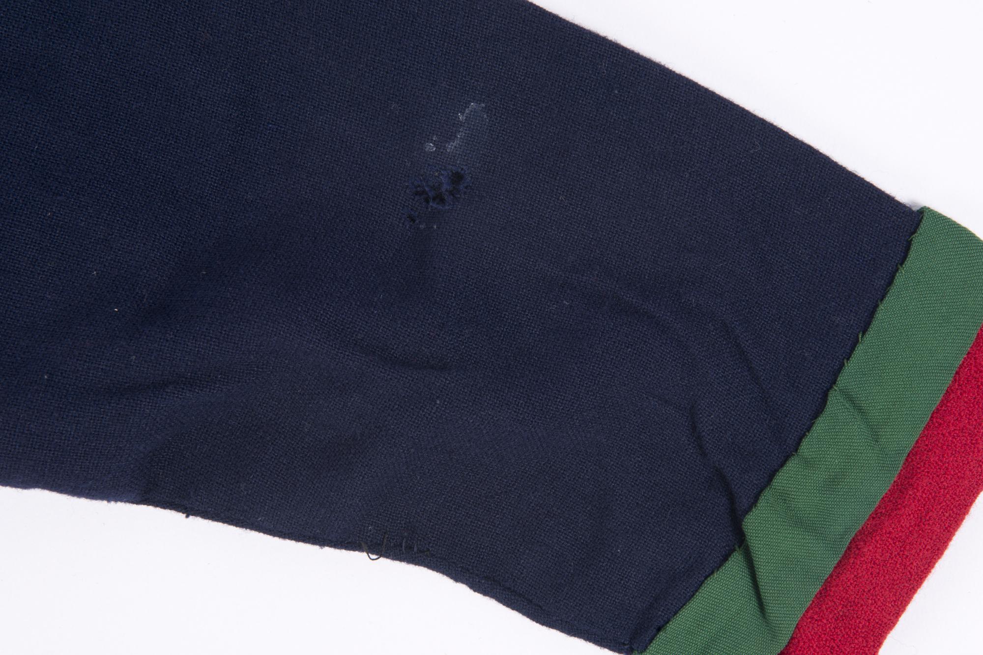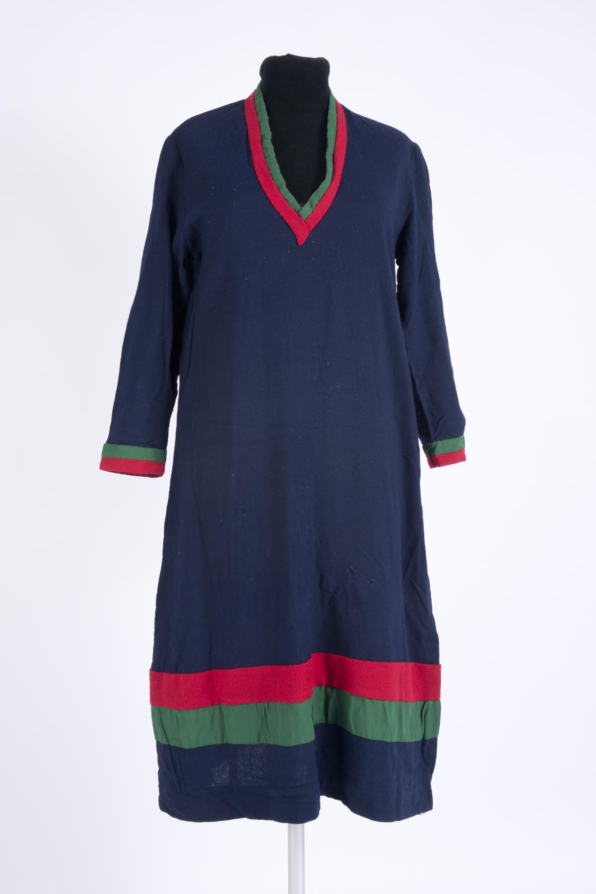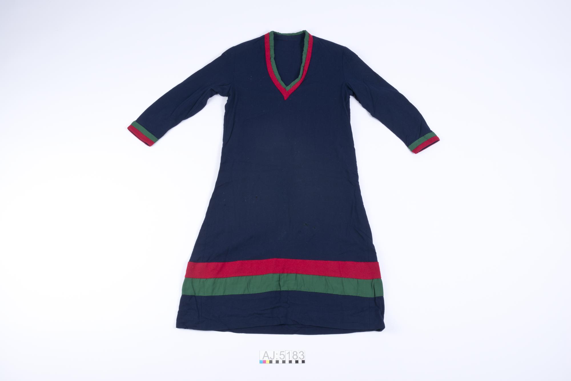 Sydsamisk kvinnokolt av blått kläde. Dektoration i v-ringning, ärmkanter och nederkant med rött ulltyg och grönt bomullstyg.