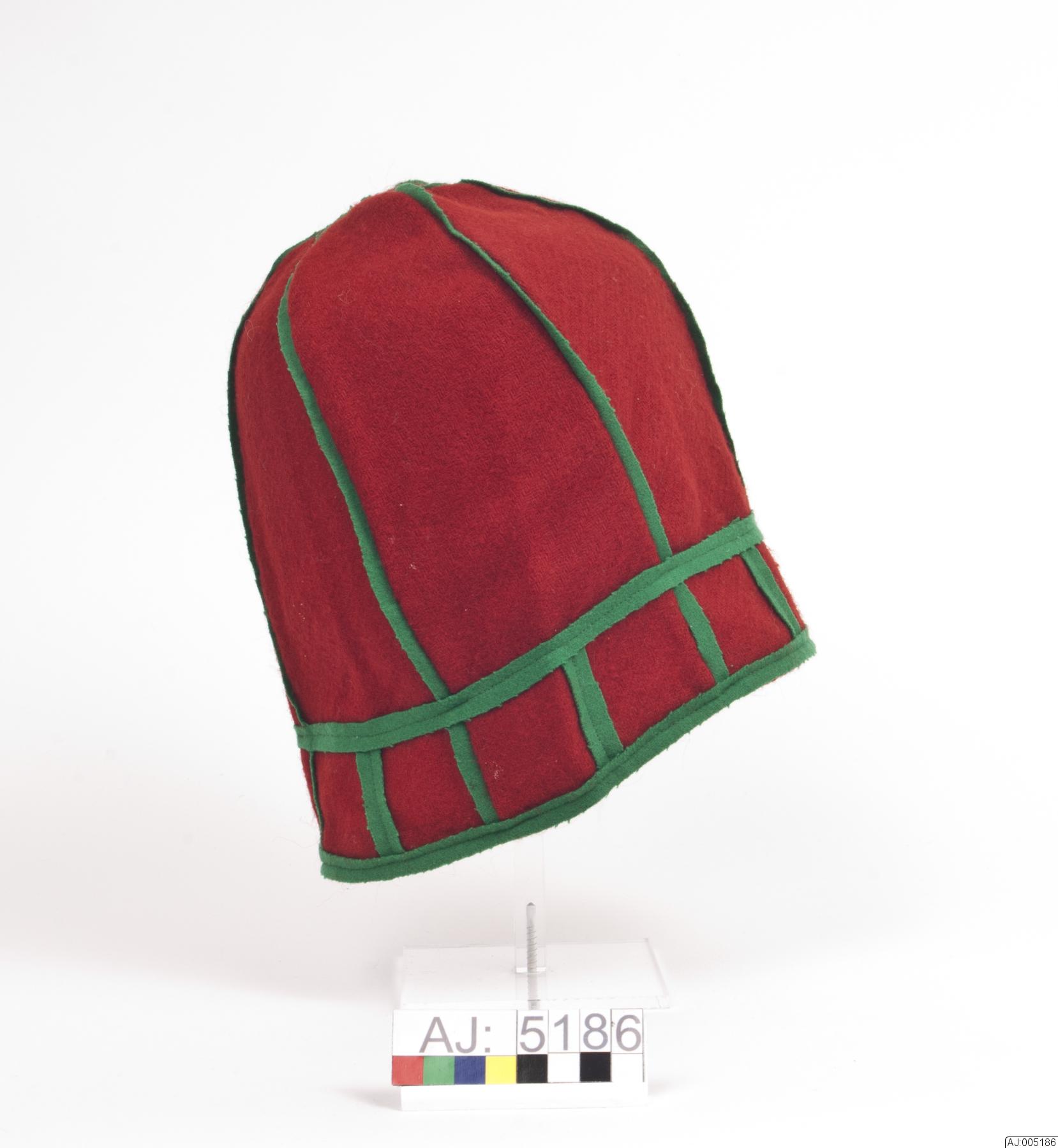 Sydsamiskt kilmösssa för kvinna. Sydd av rött ulltyg. Sex kilar med gröna klädesremsor i sömmarna. En1 cm bred grön vadmalremsa är sydd intill nederkanten och en likadan parallell klädesremsa ca 4 cm ovanför. Nedtill två rader klädesremsor och mellan varje kilsöm är en extra liten grön lodrätt klädesremsa fastsydd.