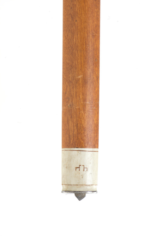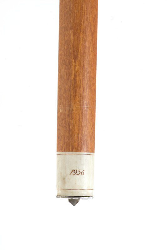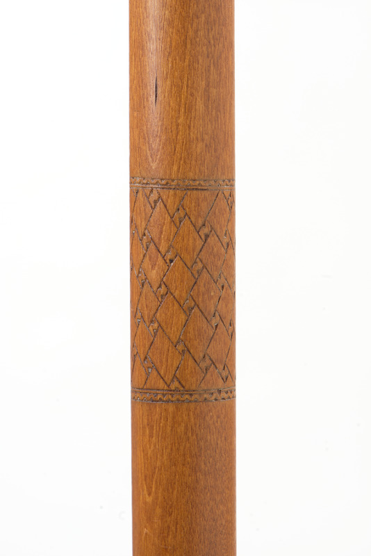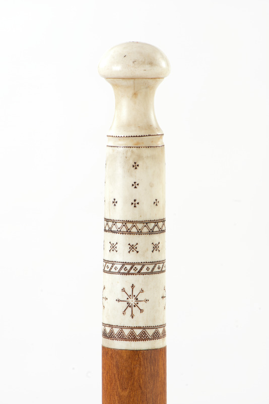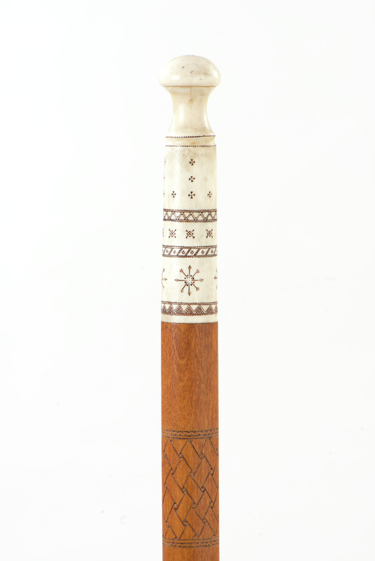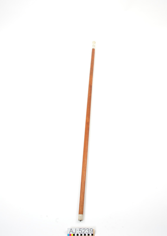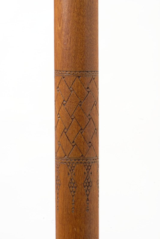 - Vandringsstav av trä med en rund knopp och fot av renhorn. Träet har utskurna mönster och hornet är gravetat. På foten är ingraverat: 1956 samt tillverkaren bomärke. Under foten är en platta och en pigg av järn.