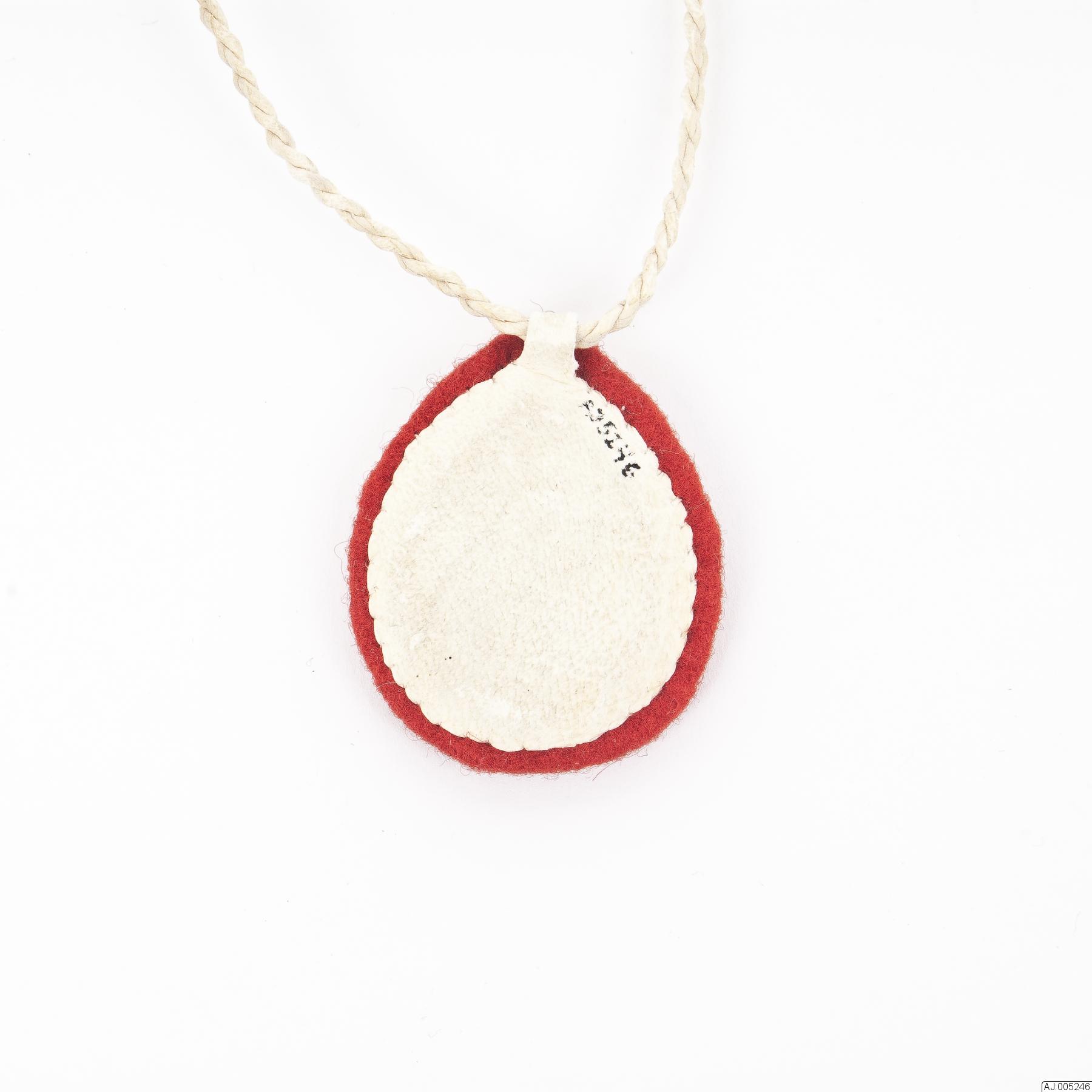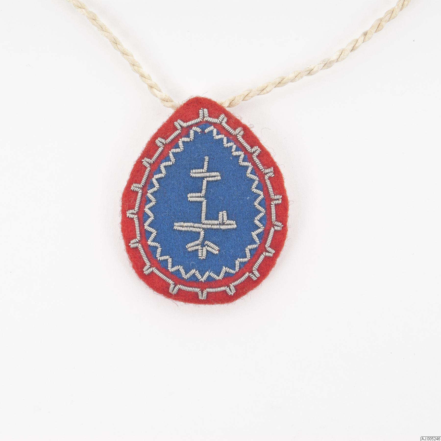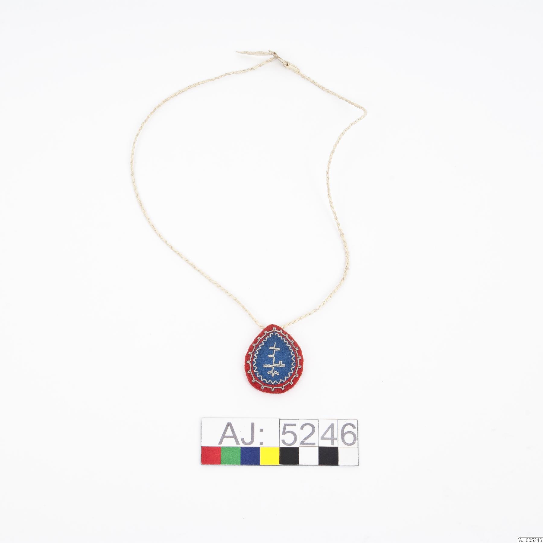 - Halssmycke/halsband i form av ett hänge på skinnsnodd. Hänge i droppform av tenntrådsbroderad rött och blått kläde (blåa färgen i mitten). På baksidan vitgarvat renskinn. Halssmycket har ngåt hårt isytt, som en form och tyngd. Halsbandet hänger i en tvinnad snodd av vitgarvat renskinn med ett litet lås av renhorn, i form av en májdde, lulesamiskt bältesspänne.