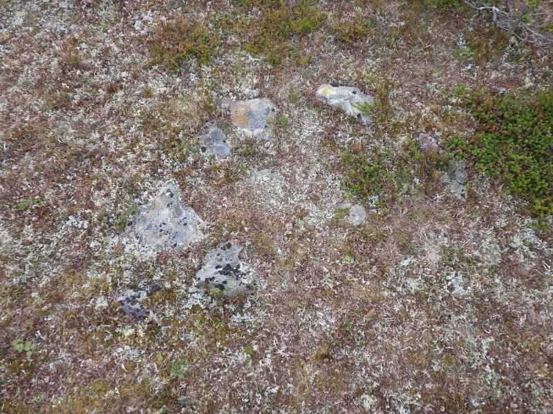 Härd på västra Härráláhko. (1): mot nordväst med Goabddábákte i bakgrunden, (2): detalj med härden.