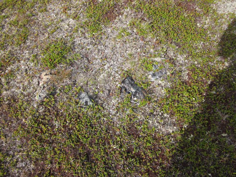 Boplats på fjällheden mellan Gurávágge och Etnavallda mittför Rivggotjåhkkå. (1): Mot norr med Låptåtjåhkkå i bakgrunden. (2): Närbild av härden.