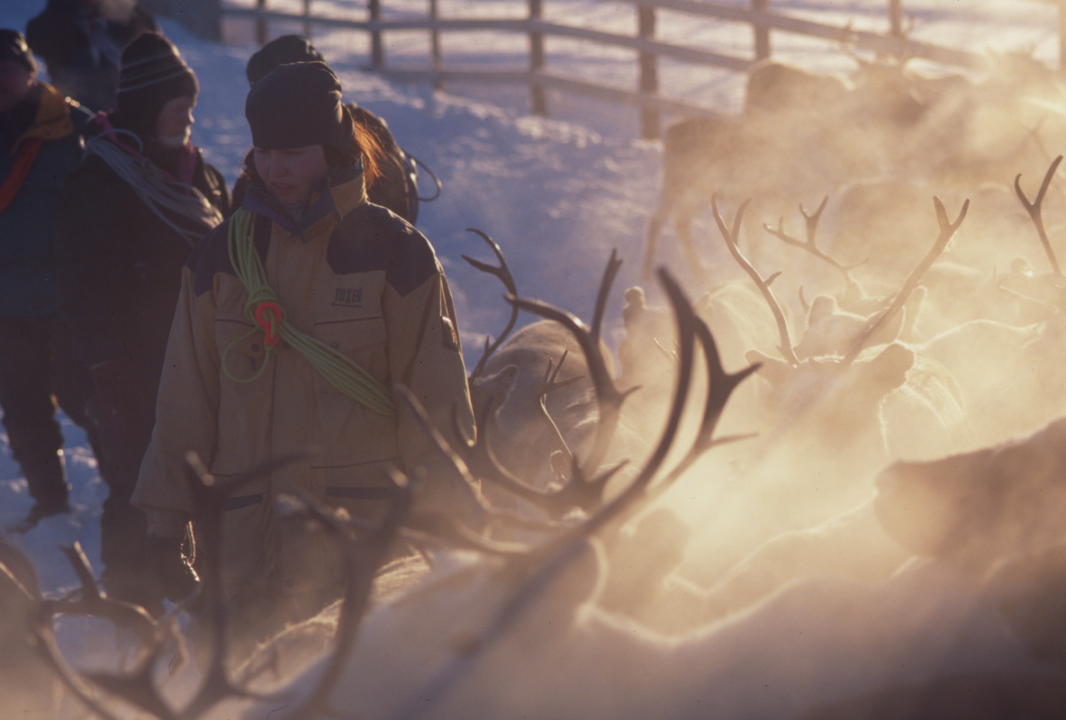 L:21:2000:1512 :: Renar, Renar i hage, Renskötare, Ren i motljus