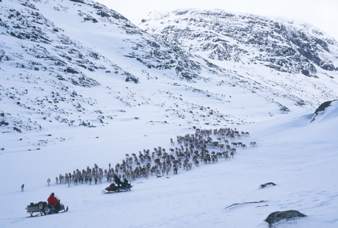 Vårflytt med ren tillsammans med renskötare från Sör Kaitum. Renhjord på väg söder om Måskotjåkkå mot Tjourvek
