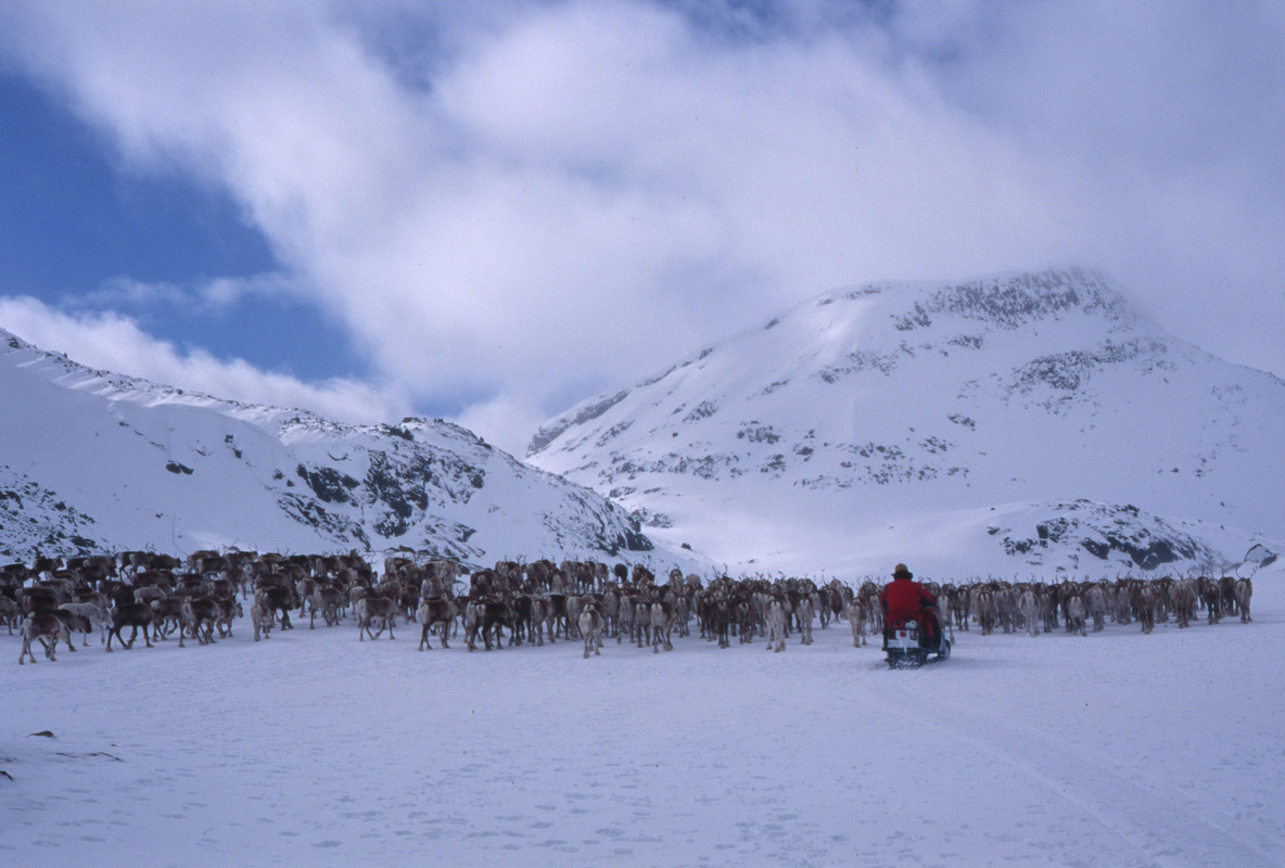 Vårflytt med ren tillsammans med renskötare från Sör Kaitum. Renhjord på väg söder om Måskotjåkkå mot Tjourvek
