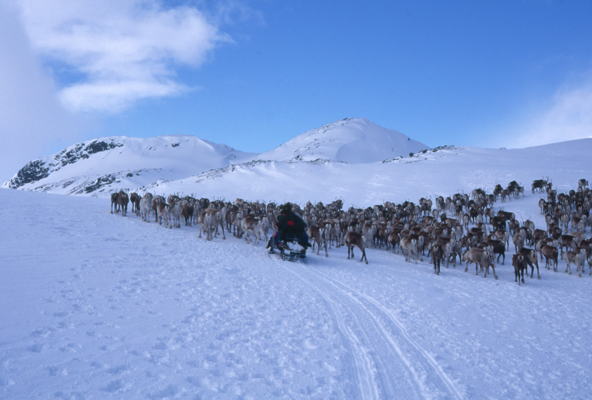 Vårflytt med ren tillsammans med renskötare från Sör Kaitum. Renhjord på väg söder om Måskotjåkkå mot Tjourvek