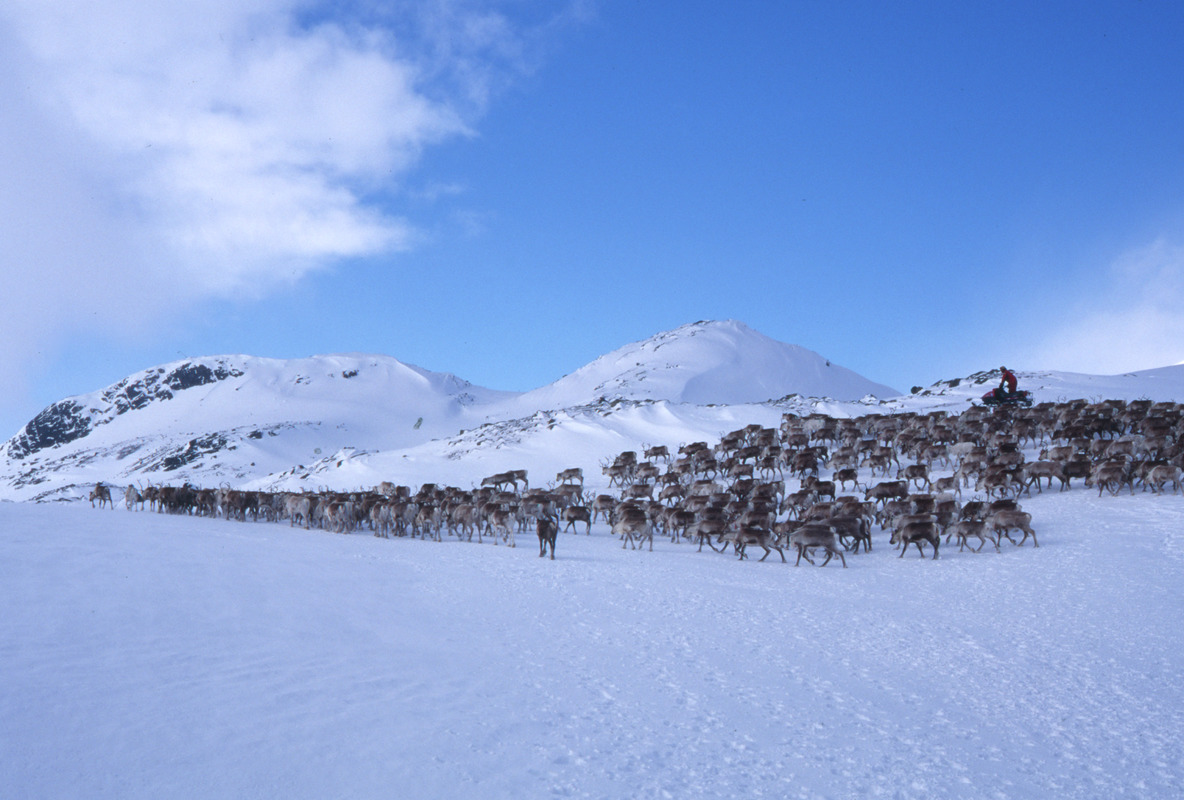 Vårflytt med ren tillsammans med renskötare från Sör Kaitum. Renhjord på väg söder om Måskotjåkkå mot Tjourvek