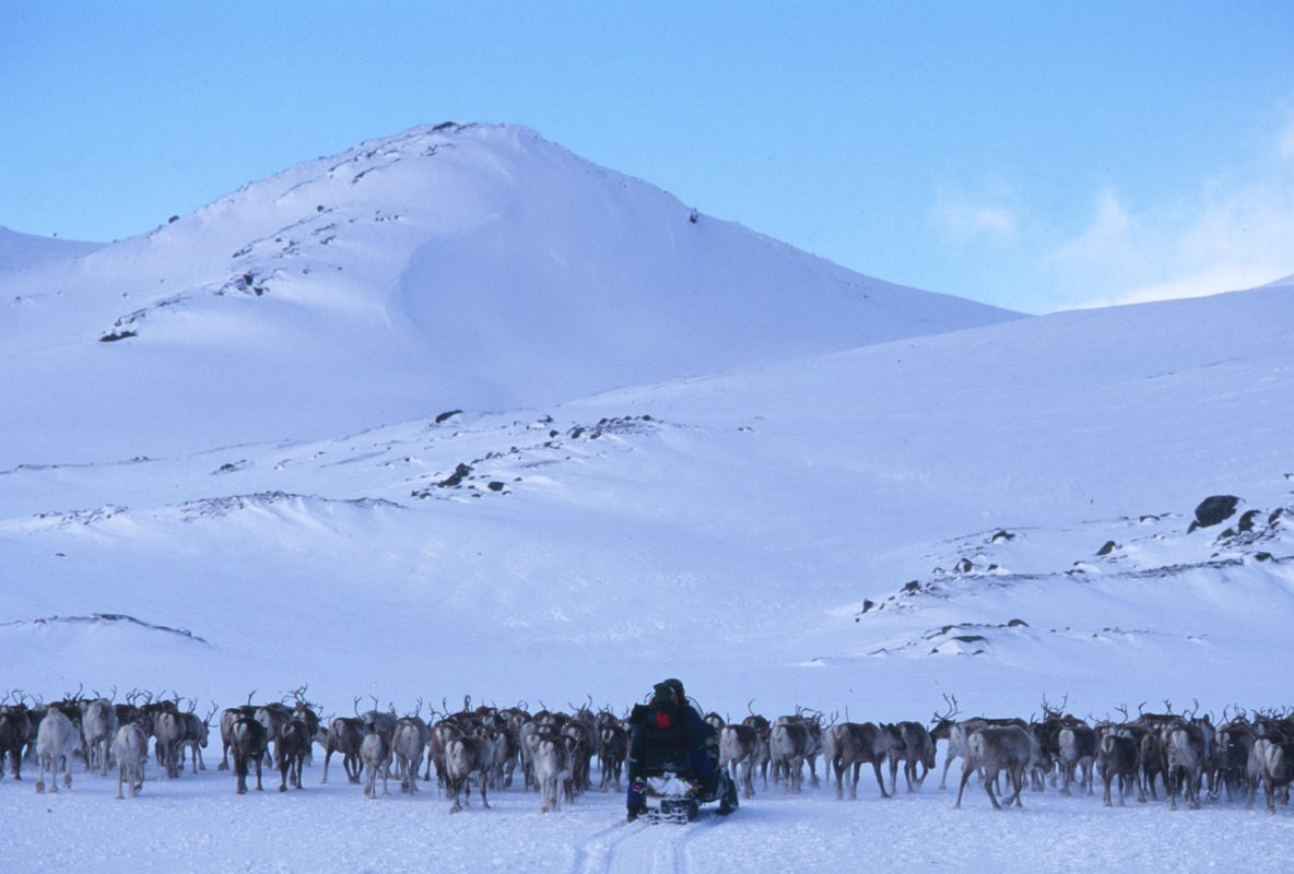 Vårflytt med ren tillsammans med renskötare från Sör Kaitum. Renhjord på väg söder om Måskotjåkkå mot Tjourvek