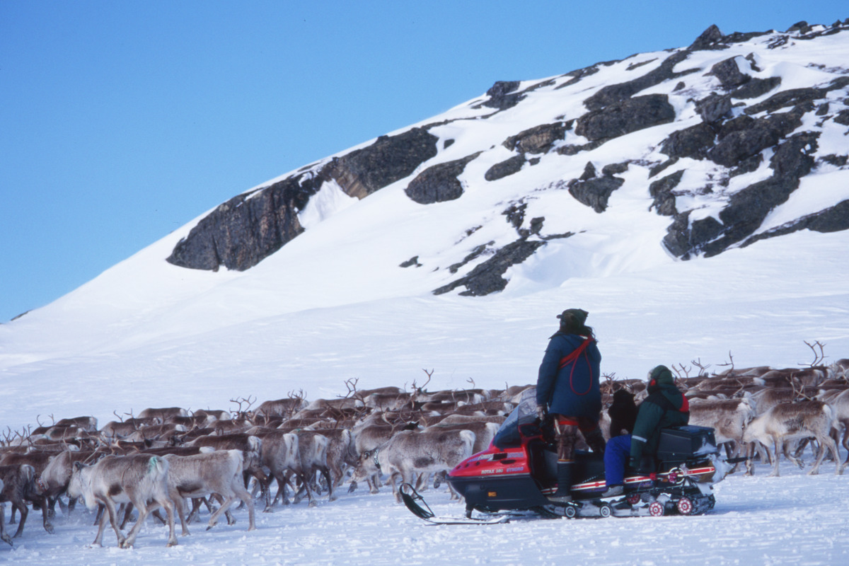 Vårflytt med ren tillsammans med renskötare från Sör Kaitum. Renhjord på väg söder om Måskotjåkkå mot Tjourvek