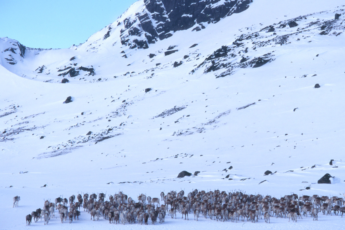 Vårflytt med ren tillsammans med renskötare från Sör Kaitum. Renhjord på väg söder om Måskotjåkkå mot Tjourvek