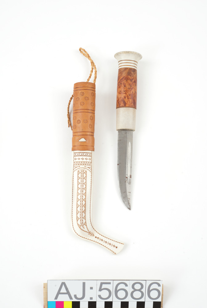 Kniv med slida. Med ristning i ett slags slingmönster, skaft i masur.