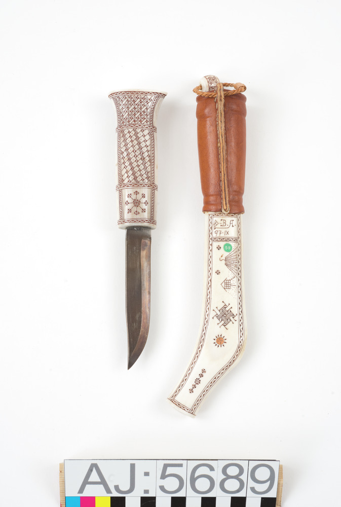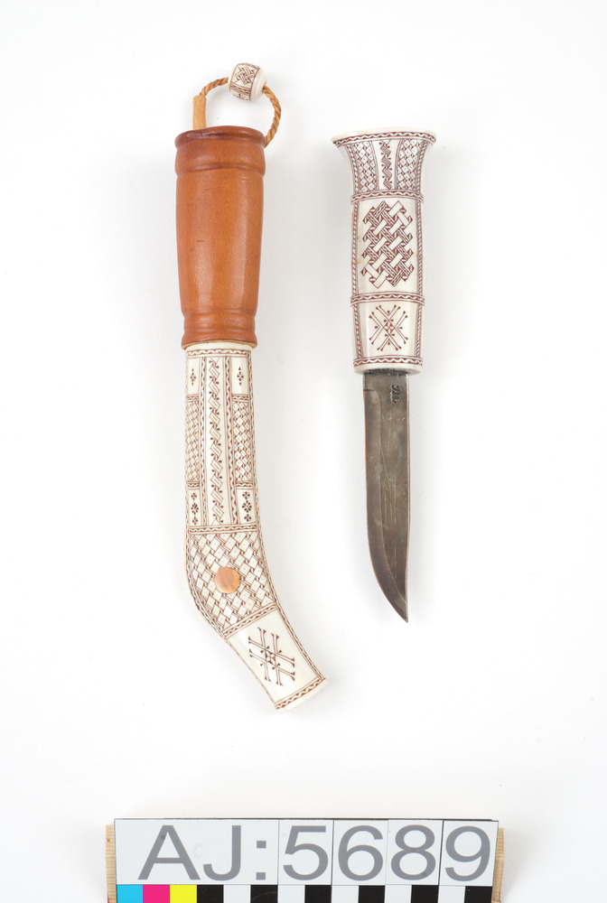 Kniv med slida. Riklig gravyr, sydsamisk.