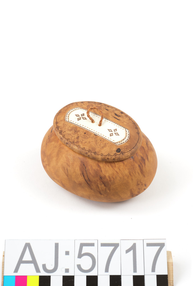 AJ 5717:1-2 dosa med lock. I masurbjörk med horninlägg i locket.