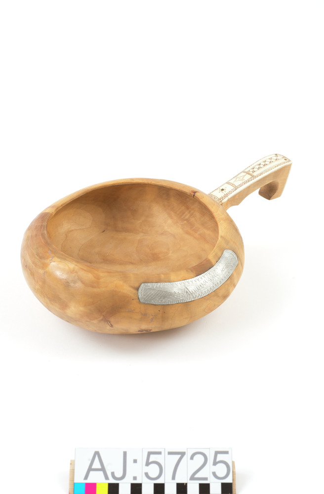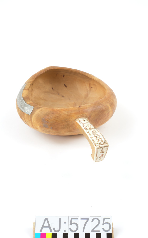 Mjölkningskärl av björk. Med horninlägg samt hornplatta på handtaget.