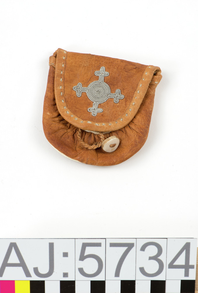 Börs av renskinnmed tenntrådsbroderier och hornknapp