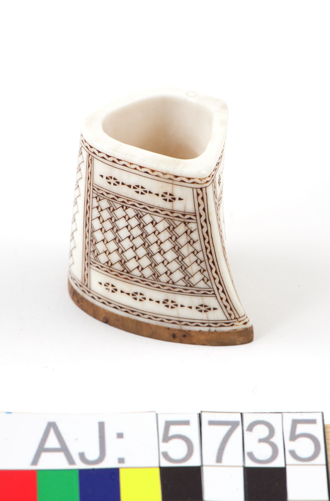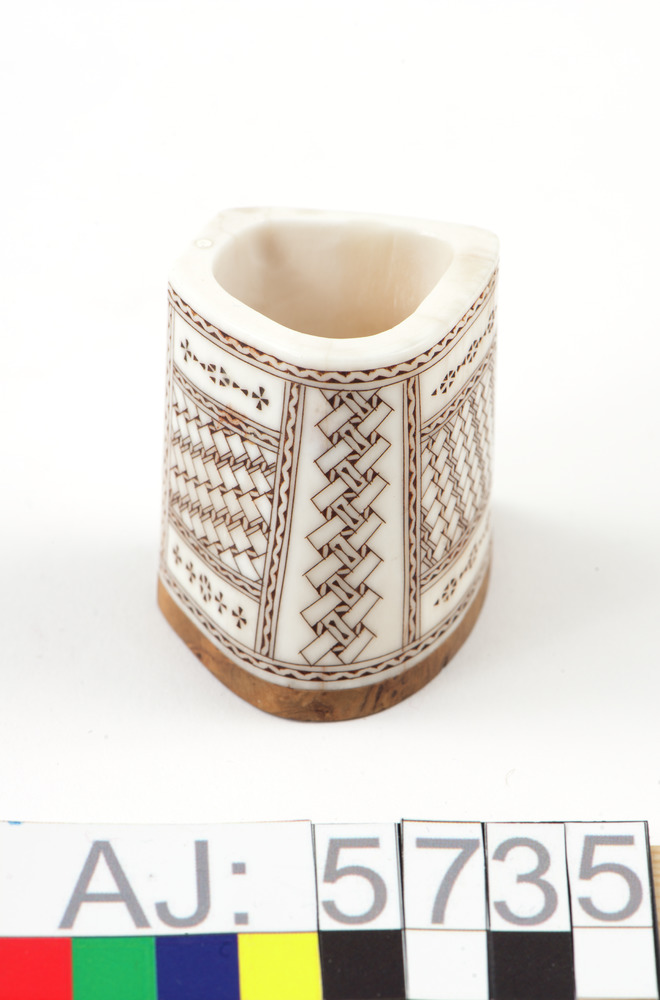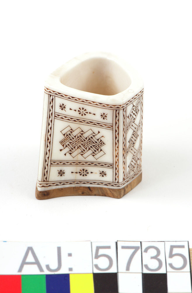 Ställ för tandpetare av älghorn. Botten av trä. Sydsamisk gravyr.