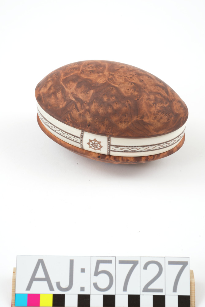 Dosa av björkrot, typ svepask med horn i svepet. Graverad.