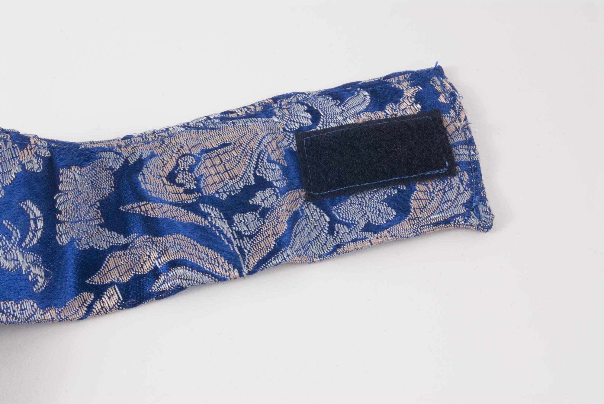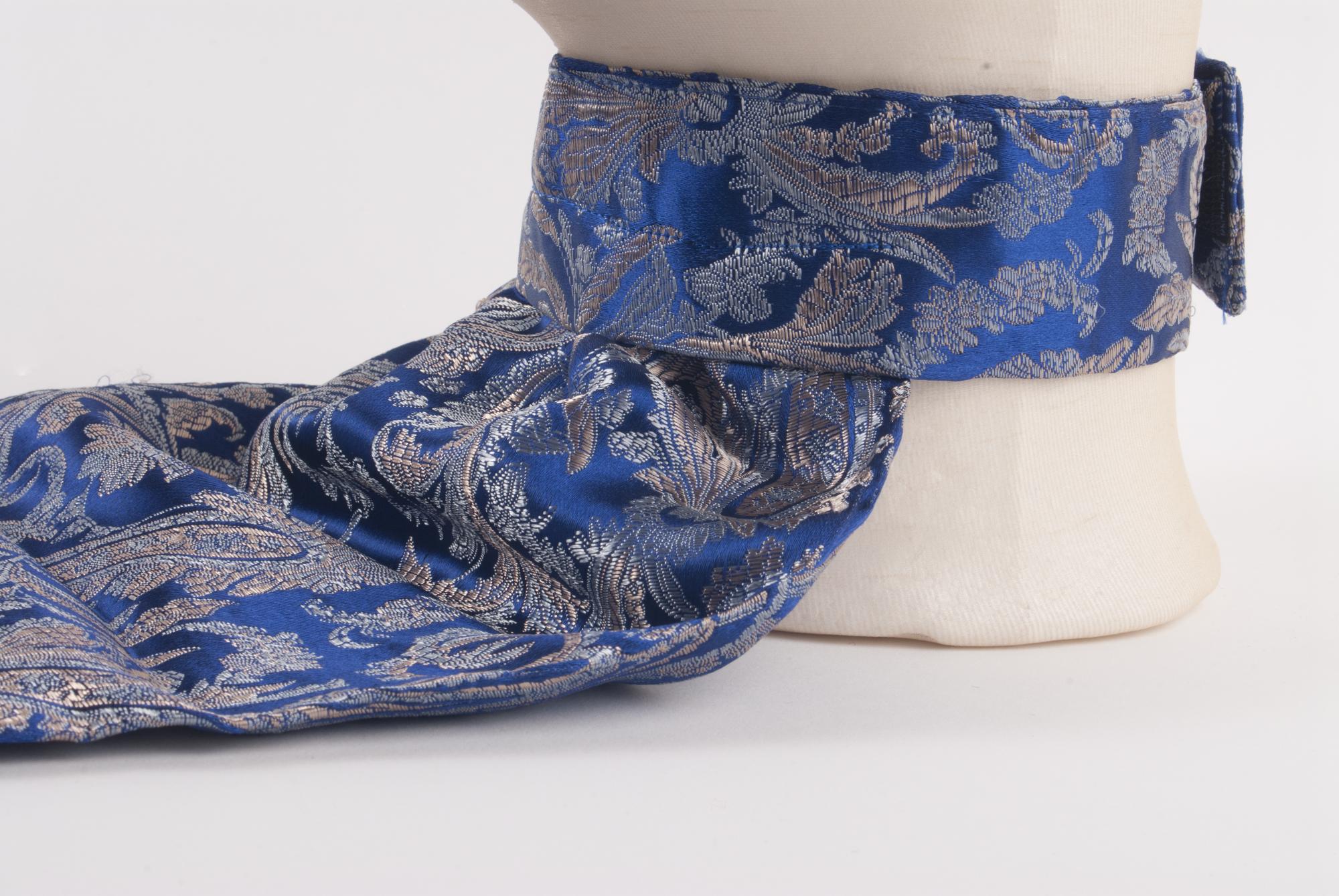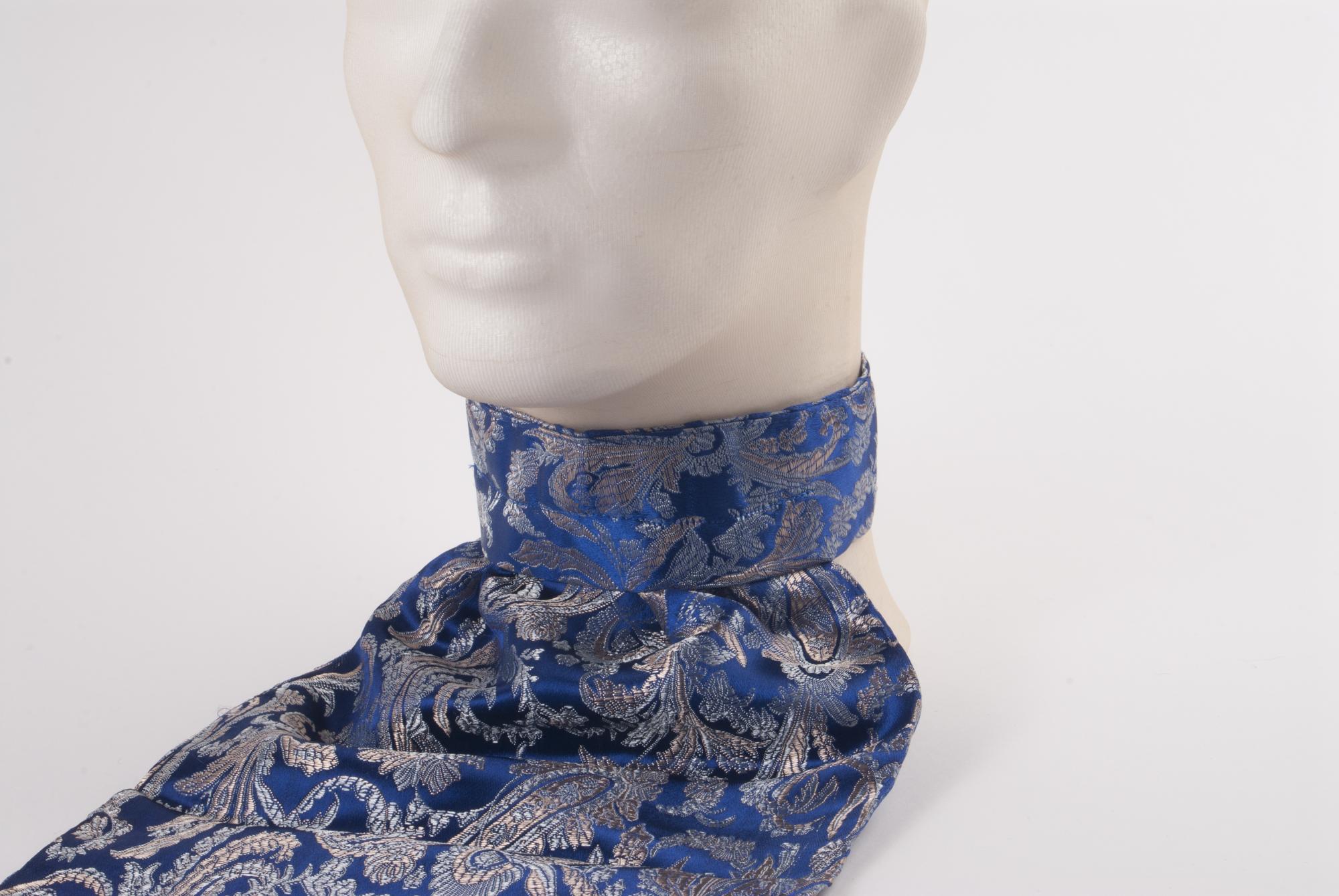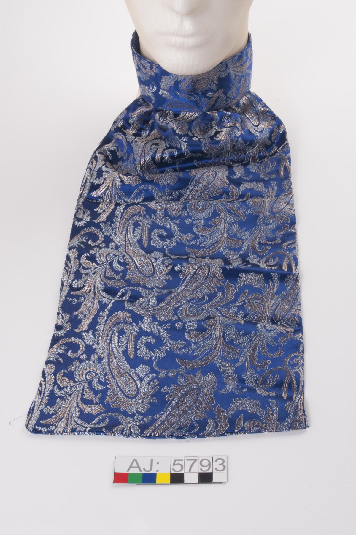 Halsduk för man till nordsamisk kolt. Att bära innanför halssprundet. Av syntettyg med paisley-mönster i silver och guld på blå botten. Sydd med halskant som fästes baktill. Framtill är en långsmal del fastsydd, att ha innanför sprundet.