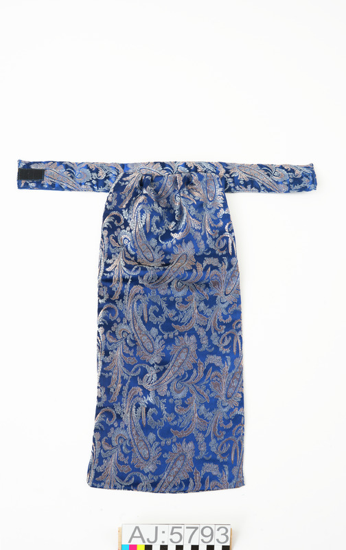 Halsduk för man till nordsamisk kolt. Att bära innanför halssprundet. Av syntettyg med paisley-mönster i silver och guld på blå botten. Sydd med halskant som fästes baktill. Framtill är en långsmal del fastsydd, att ha innanför sprundet.