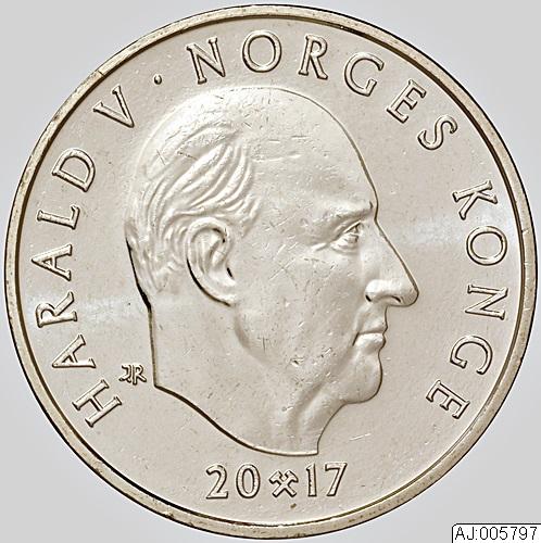 H. M. Kong Harald Vs portrett i profil sett fra høyre. Rundt portrettet: HARALD V∙ NORGES KONGE. Til venstre for portrettets halsavsnitt: kunstnerens signatur: IAR. Under portrettet: årstallet 2017 med Det Norske Myntverkets merke hammer og bergsjern i midten.