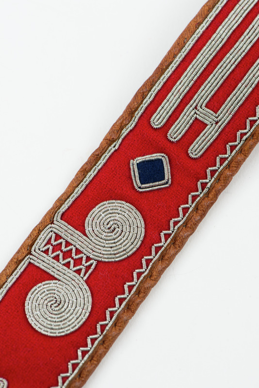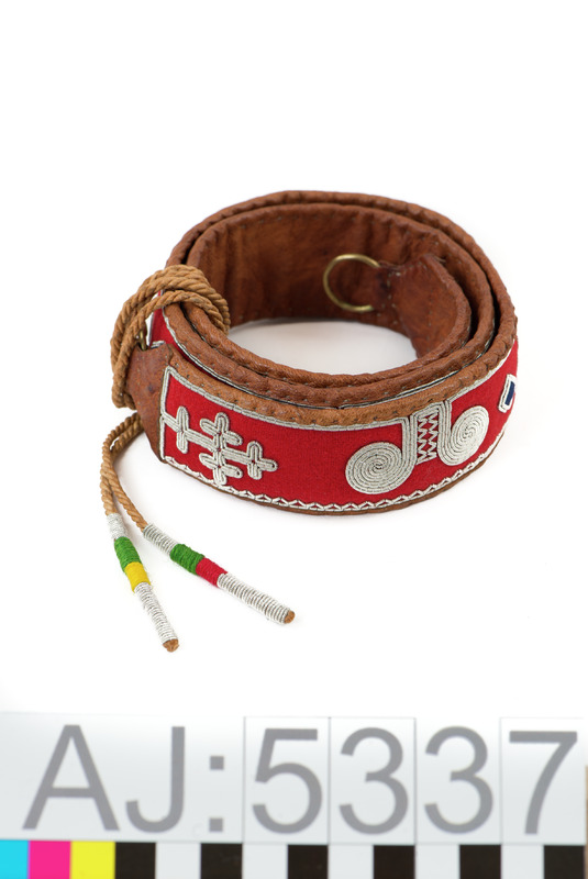 - bälte av rött kläde, fodrad med barkgarvat renskinn. Skinnet sytt så det kantar bältet på framsidan. Tenntrådsbroderier och dekorationer med mörkblått kläde. I vardera änden en mässingring. I ena sidans mässingsring är en tvinnad snodd av renskinn fastknuten. Snoddens ändar är lindade med spunnen tenntråd och rött, grönt och gult, grönt ullgarn.