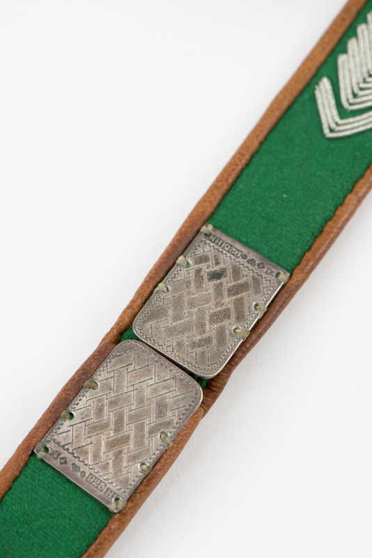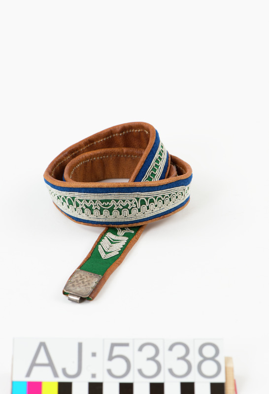 Bälte av grönt och blått kläde med tenntrådsbroderier, fodrad med barkgarvat renskinn. Skinnet sytt så det kantar bältet på framsidan. Spänne av silver, märkt WA. Spännet har flätmönster ingraverat.