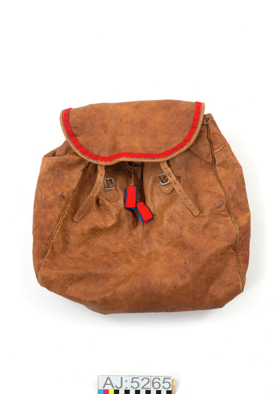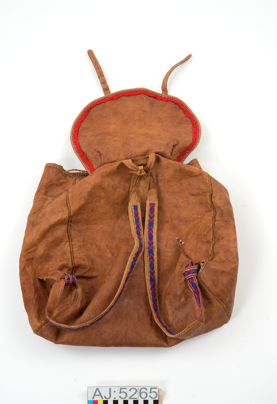 - Ryggsäck med lock, av barkgarvat renskinn. Locket är kantat med skinn och har en en röd klädesremsa i sömmen som dekoration. Dekorerad ovanpå klädet med en yllsnodd tvinnad av blått och gult ullgarn. Två spännen av metall för att fästa locket mot säcken. Bärband av mönstervävt band av yllegarn fodrad med renskinn.