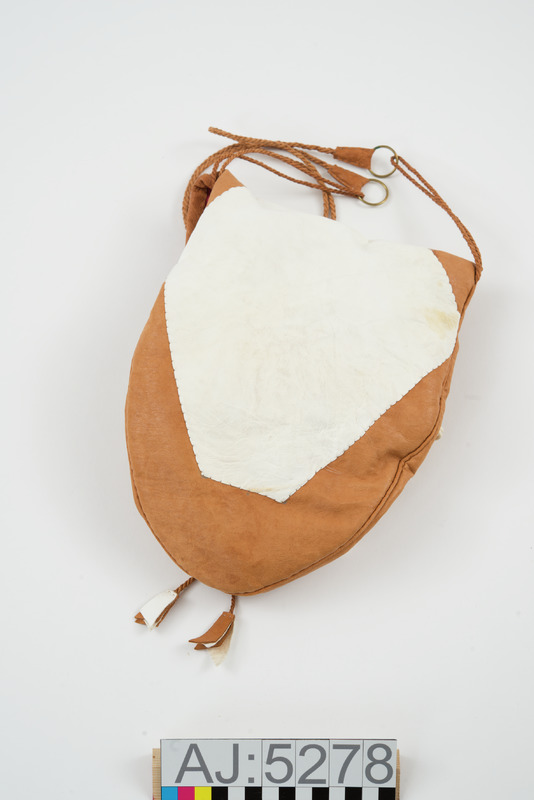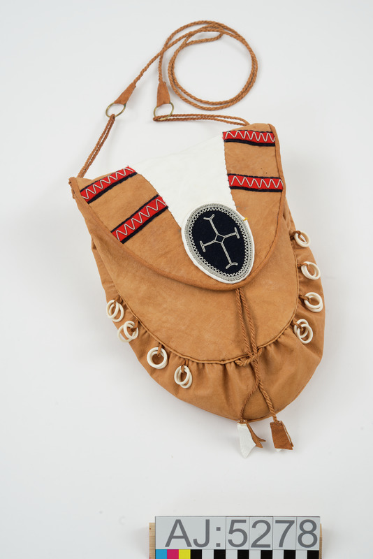 Väska med lock. Av barkgarvat renskinn och vitgarvat renskinn. Locket prydd med vitt renskinn, rött och svart kläde och tenntrådsbroderier. Tenntrådsbroderiet fram är hämtad från solsymbolen på den samiska trumman, på svart kläde. Väskan har en fram- och baksida och en botten som går upp längs sidorna. Locket "låses" med tvinnade skinnremmar med tofsar av skinn. I sömmarna dubbelvikt renskinn som mellanlägg och skinnöglor som det hänger hornringar i. Axelrem av tvinnat renskinn, som sitter fast i mässingring. Väskan är fodrad med rött bomullstyg.
