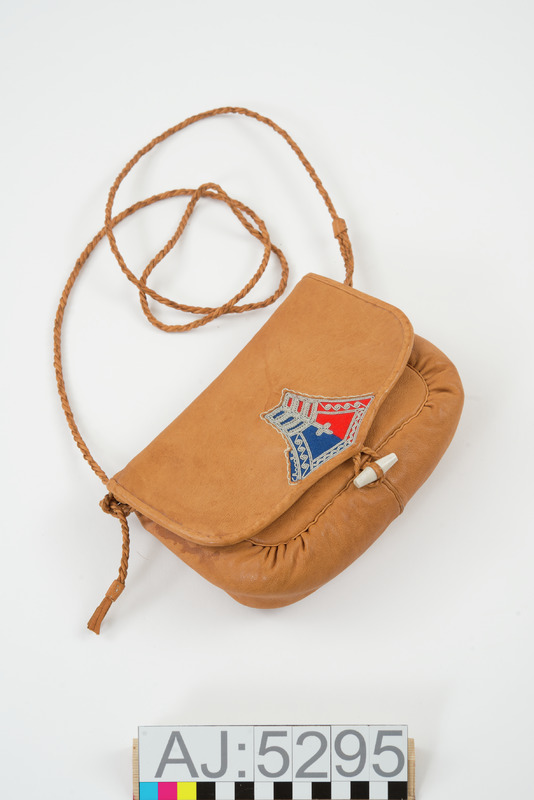 - Väska med lock. Av barkgarvat renskinn. Locket har en utskärning i skinnet innanför ett inlägg av rött och blått kläde med tenntrådsbroderi. Väskan har en fram- och baksida och en bottendel rynkad mot dessa. I sömmarna dubbelvikt renskinn som mellanlägg. Fodrad med renskinn. I sömmen mellan framstycke och botten är en avlång hornknapp fastsydd, som bildar en ögla för att "låsa" väskan med. I locket är en skinnögla att fästa runt hornknappen. Axelrem av tvinnad skinnrem. Sydd med sentråd.