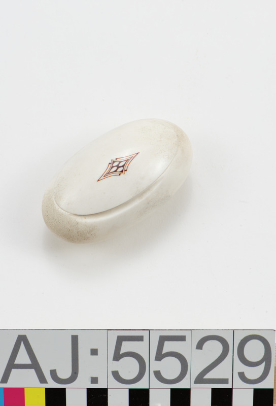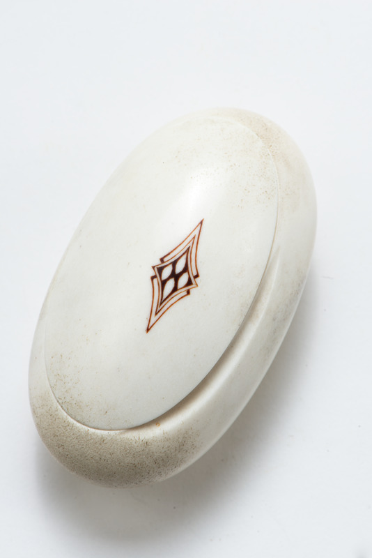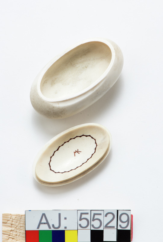 Ask av horn med lock. Äggformig, Graverad