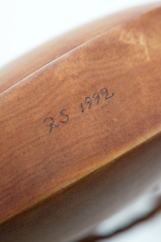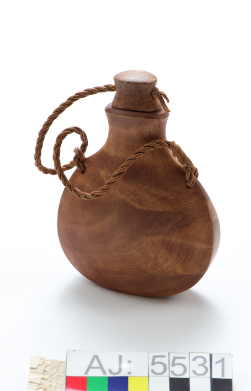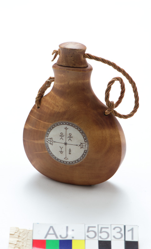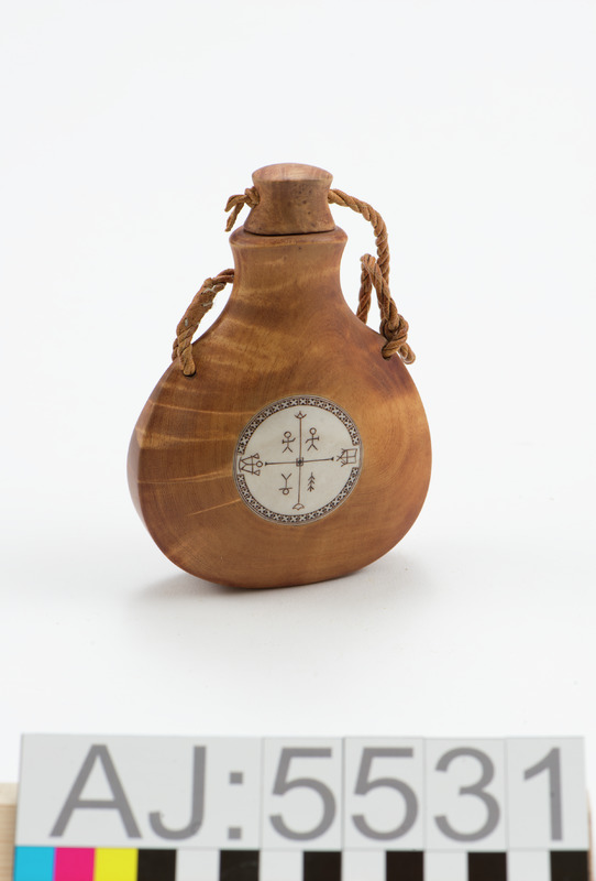 - Utförd av ett stycke björk, urgröpt. På framsidan inläggning med rund renhornsplatta. Graverad med solsymbol och gudatecken från samiska trumman. Kork av trä, sitter fast i flaskan med en tvinnad skinnsnodd