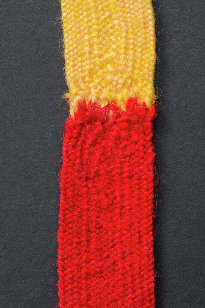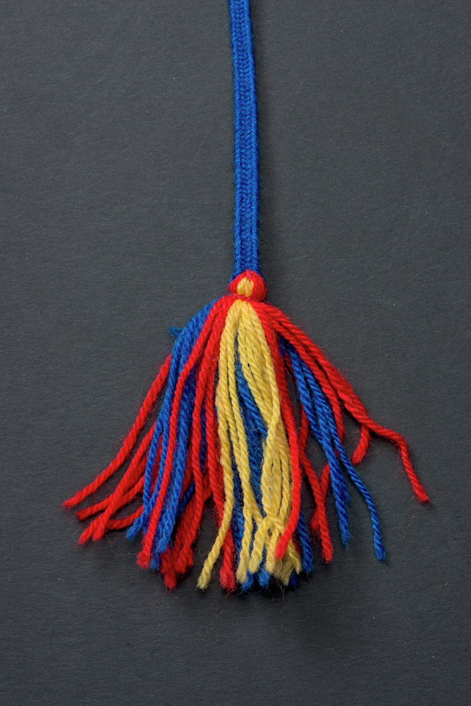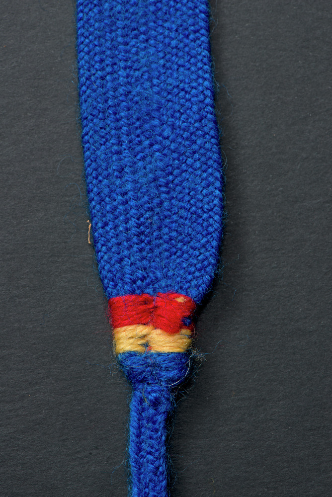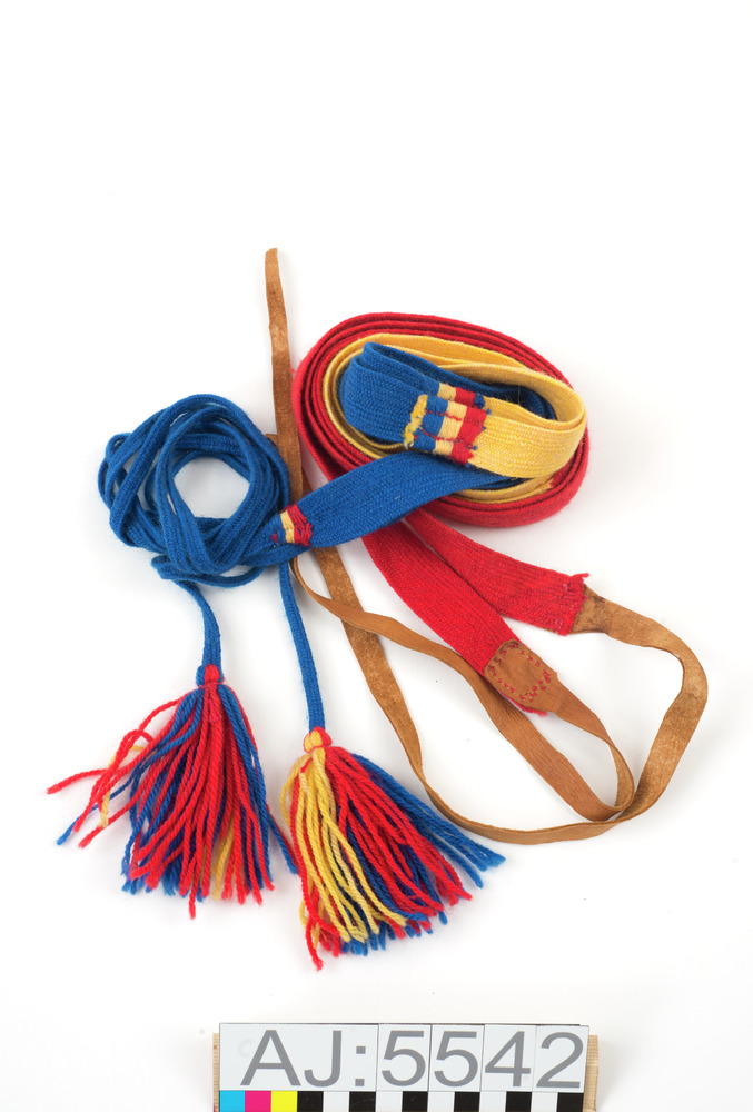 AJ 5542:1-2 ett par jukkasjärvi skoband i tre färgfält; röd, gul och blå. För kvinna. Lagda/flätade av ullgarn. I ena änden en skinnrem för att knyta fast i skon i andra änden tofs.