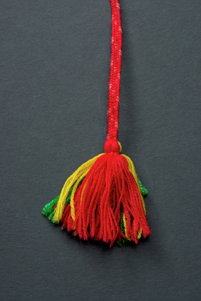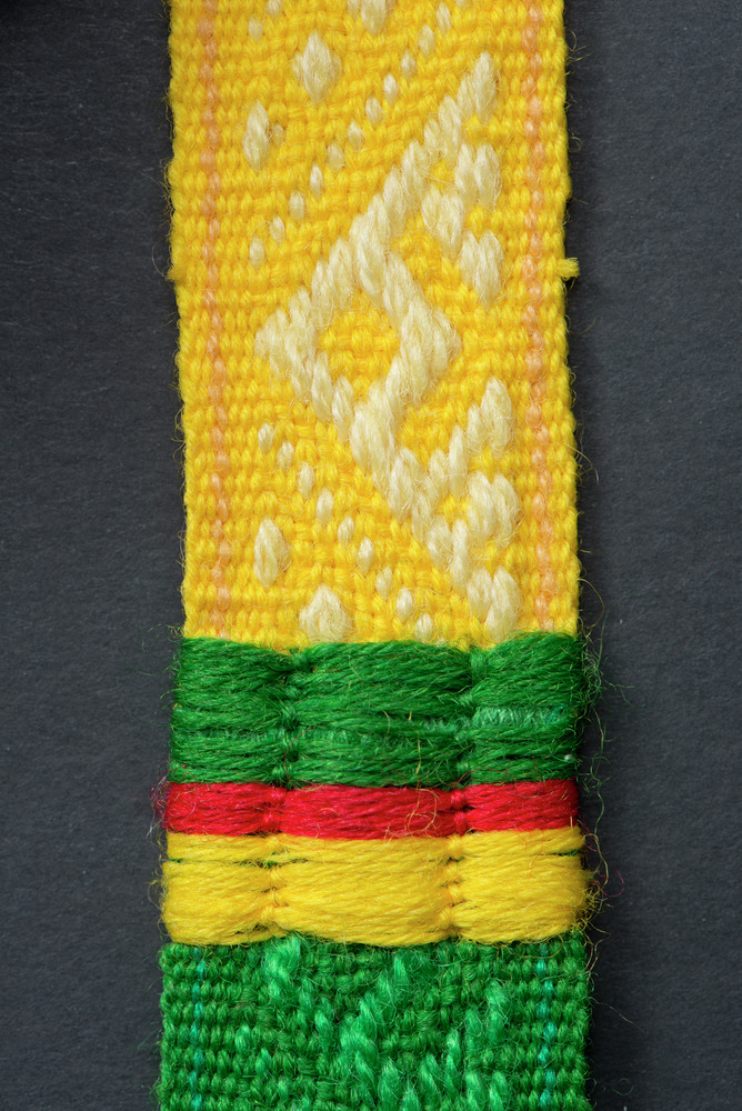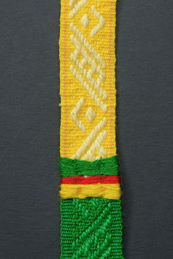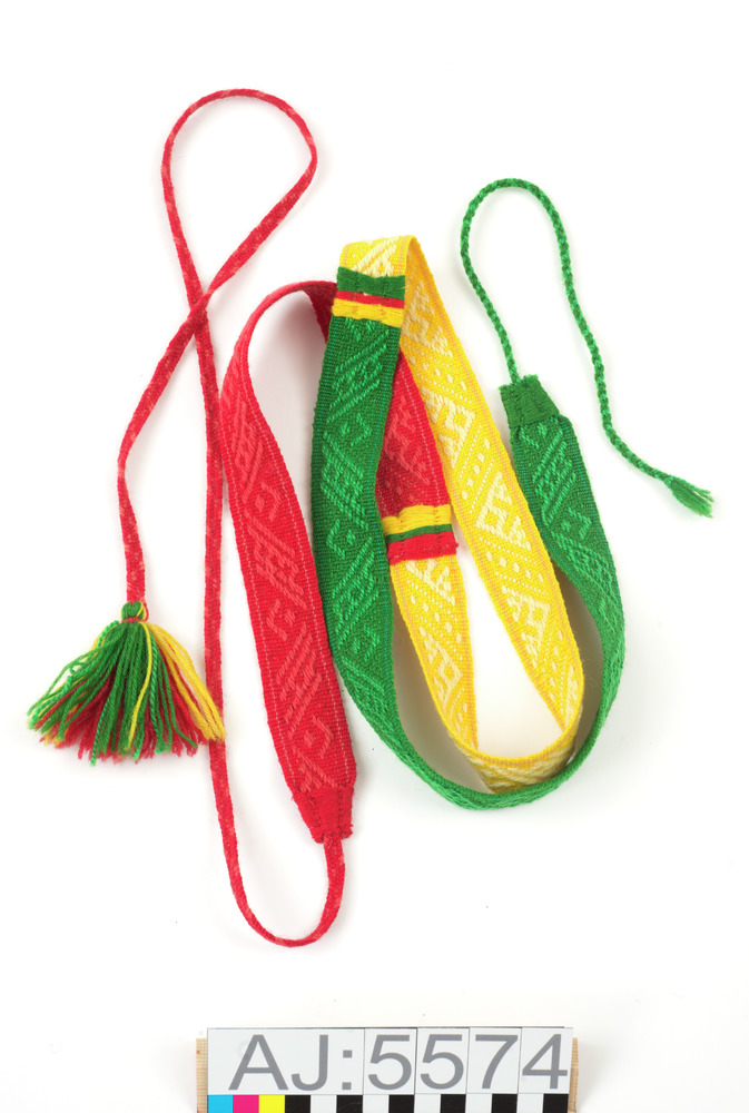 - Ett mönstervävt kvinnoskoband, av ett par. Nordsamiskt, Jukkasjärvi. Vävd med ullgarn i tre delar: hopsatt av en bandlängd rött, en bandlängd gult och en bandlängd grönt. Mönstervävt med garn i samma färg. I ena änden med en fyrflätad snodd av ullgarn för att knyta fast i skon och i andra änden en likadan fyrfläta, fast längre, som avlutas med en tofs.
