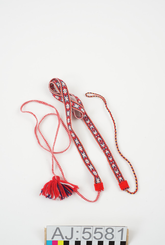 - ett mönstervävt skoband av ullgarn. Nordsamiskt. För pojke. Bandet är skott med rött kläde i varje ände. I ena änden är en flätad snodd av ullgarn med ögla i slutet för att knyta fast i skon fastsydd. I andra änden ett smalt lagt band som avslutas med tofs.