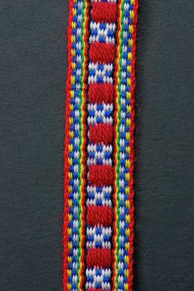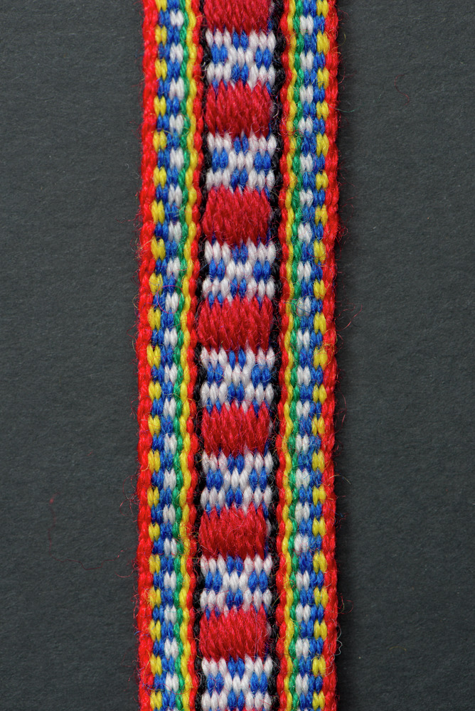 Mönstervävt band av ullgarn med mönster av en ruta. Varje ände avslutas med två tsávekbátte/omlindade avslutningar som avslutas med varsin tofs. Färger: rött, vitt, blått, svart, gult, grönt.