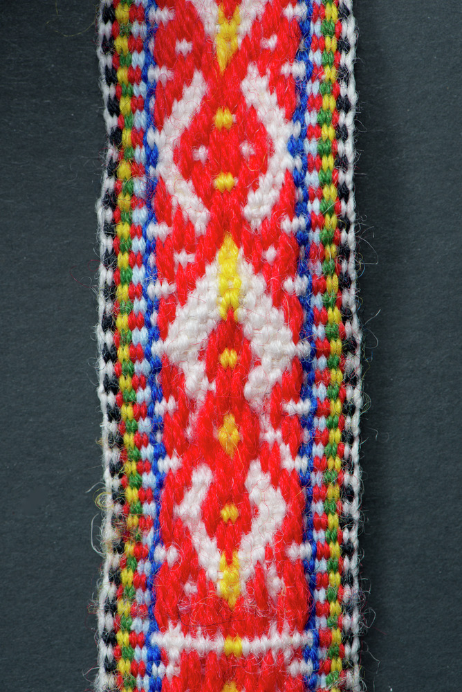 Ett skoband av ett par. Nordsamiskt mansskoband. Vävd med ullgarn. I ena änden är en röd klädeslapp och en flätad snodd av ullgarn för att knyta fast i skon fastsydd. I andra änden ett smalt lagt band som avslutas med tofs av ullgarn. Färger: rött, vitt, gult, blått, grönt, svart.