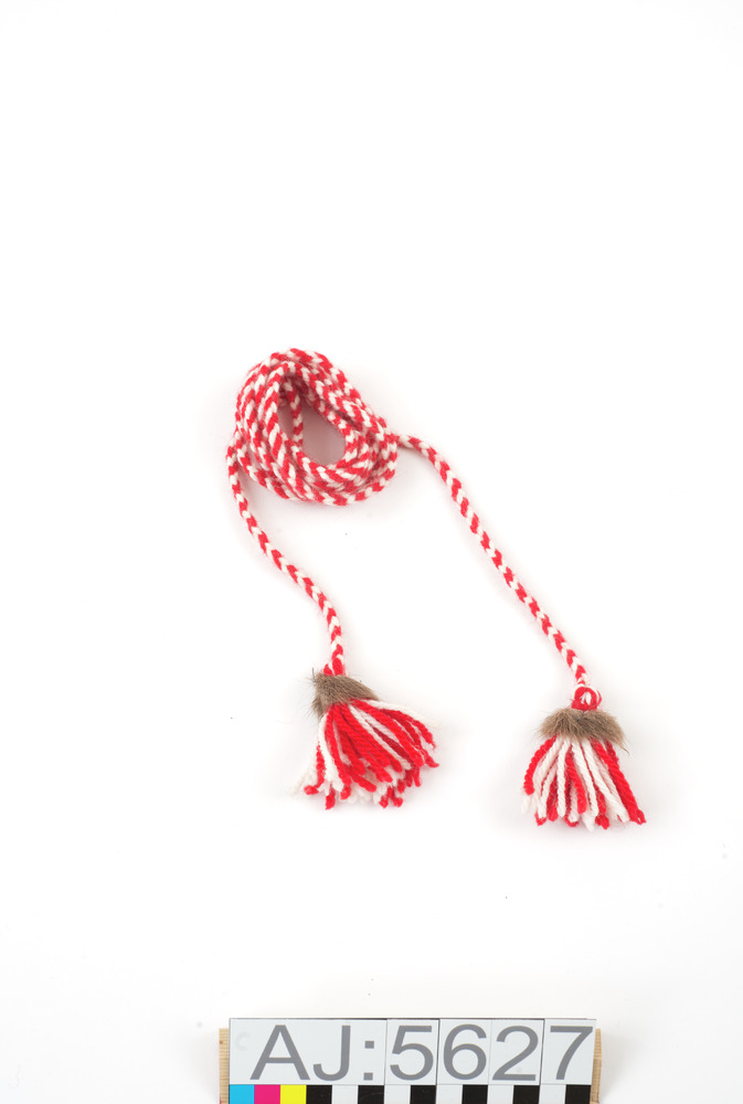 Band flätat av ullgarn, vitt och rött. Med bit renpäls och en tofs i vardera ände.