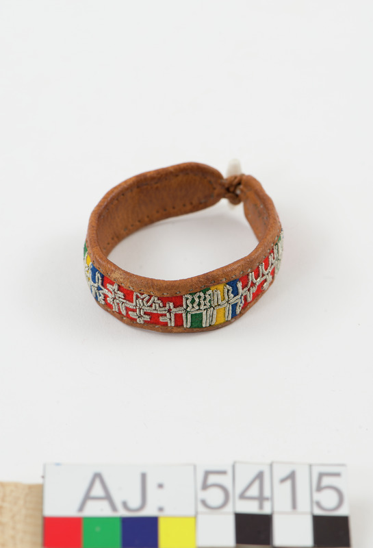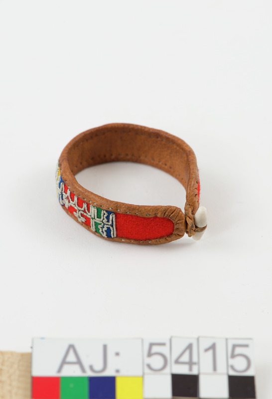 Armband av barkgarvat renskinn. Fodrad med renskinn, som vikts så den kantar utsidan. Utsidan av fält av gult, rött, grönt och blått kläde broderat med tenntråd. Stängs med skinnsnodd och hornknapp.