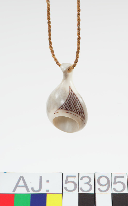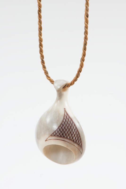 Halssmycke av renhorn. Graverat. Hänger i en tvinnad skinnsnodd med lås av horn.