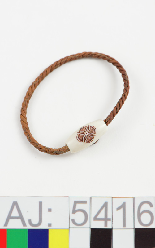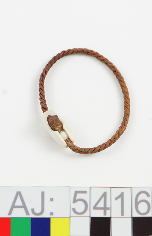 Armband av tvinnat renskinn. På snodden är en rund "knapp" av renhorn, graverad.