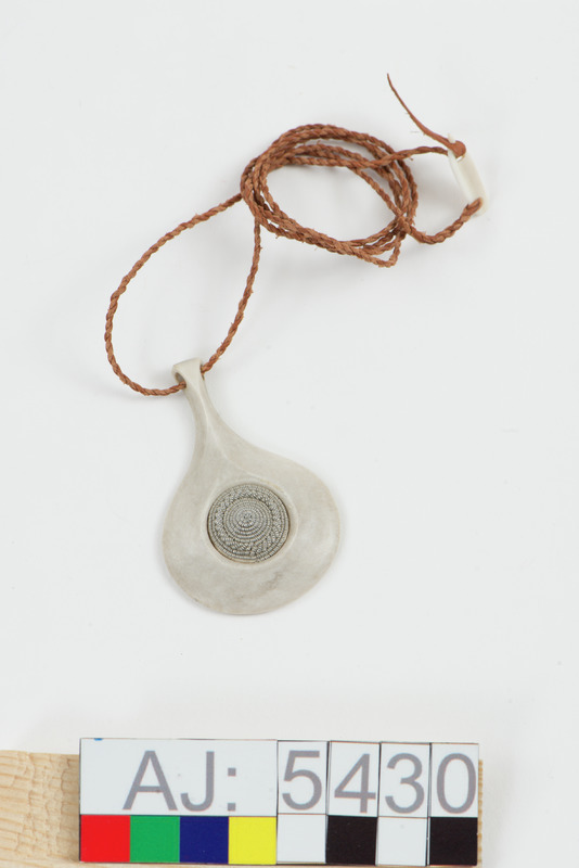- Halsband av renhorn med tenntrådsbroderi i en rundel i mitten. Upptill hål för att hänga den. Hänger i en silverkedja. Tenntrådsarbetet av Laila Poggats, som även dragit tennet och tillverkat tenntråden.