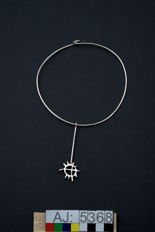 Halsband av silver: trumtecken solsymbol hängandes på silver-"tråd". Halsdelen av silver-"tråd".