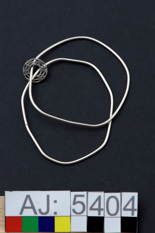 Armband av två silver"trådar". De är dragna genom en rund platta med hål i mitten och genombrutet mönster: spår efter renklövar.