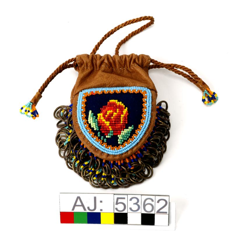 Skedpung sydd av barkgarvat renskinn. Fram- och baksida med pärlbroderier på kläde. Rött kläde ena sidan, blått kläde andra sidan. Broderiet: ena sidan ros och andra sidan blomma och blad. Bottnen har massa fastsydda mässingringar. Upptill dragsko med tvinnad skinnsnodd, med tofsar av pärlsnoddar. Handtag av tvinnad skinnsnodd.