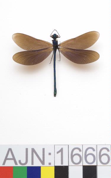- Den blå jungfrusländan föredrar habitat med rinnande vatten, som bäckar och åar, gärna med grusbotten. Hanen är ovanligt revirhävdande och till skillnad från de flesta andra trollsländearters hanar så uppvaktar han honan inför parningen genom att utföra en speciell flykt omkring henne. Efter parningen lägger honan äggen, ibland tillsammans med hanen och ibland ensam, i stjälkarna på vattenväxter. Utvecklingstiden från ägg till imago är i Sverige två till tre år och flygtiden är juni till augusti. I varmare delar av utbredningsområdet kan utvecklingen gå något fortare. Exemplaret är en hane vilken är insamlad i Jokkmokks Fjällträdgård, vid partivis raskt rinnande bäck omgiven av mestadels videsnår/videkärr.